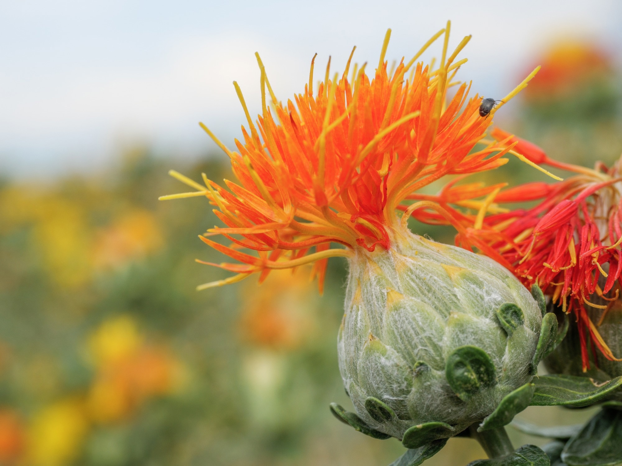 Safflower (Carthamus tinctorius), a thistle-like plant from the Asteraceae family, has been cultivated for centuries for its seeds to produce high-quality oil, animal feed, dyes, and medicinal compounds. Traditionally, the brightly colored florets of safflower were used to color and flavor food and textiles before synthetic dyes emerged.