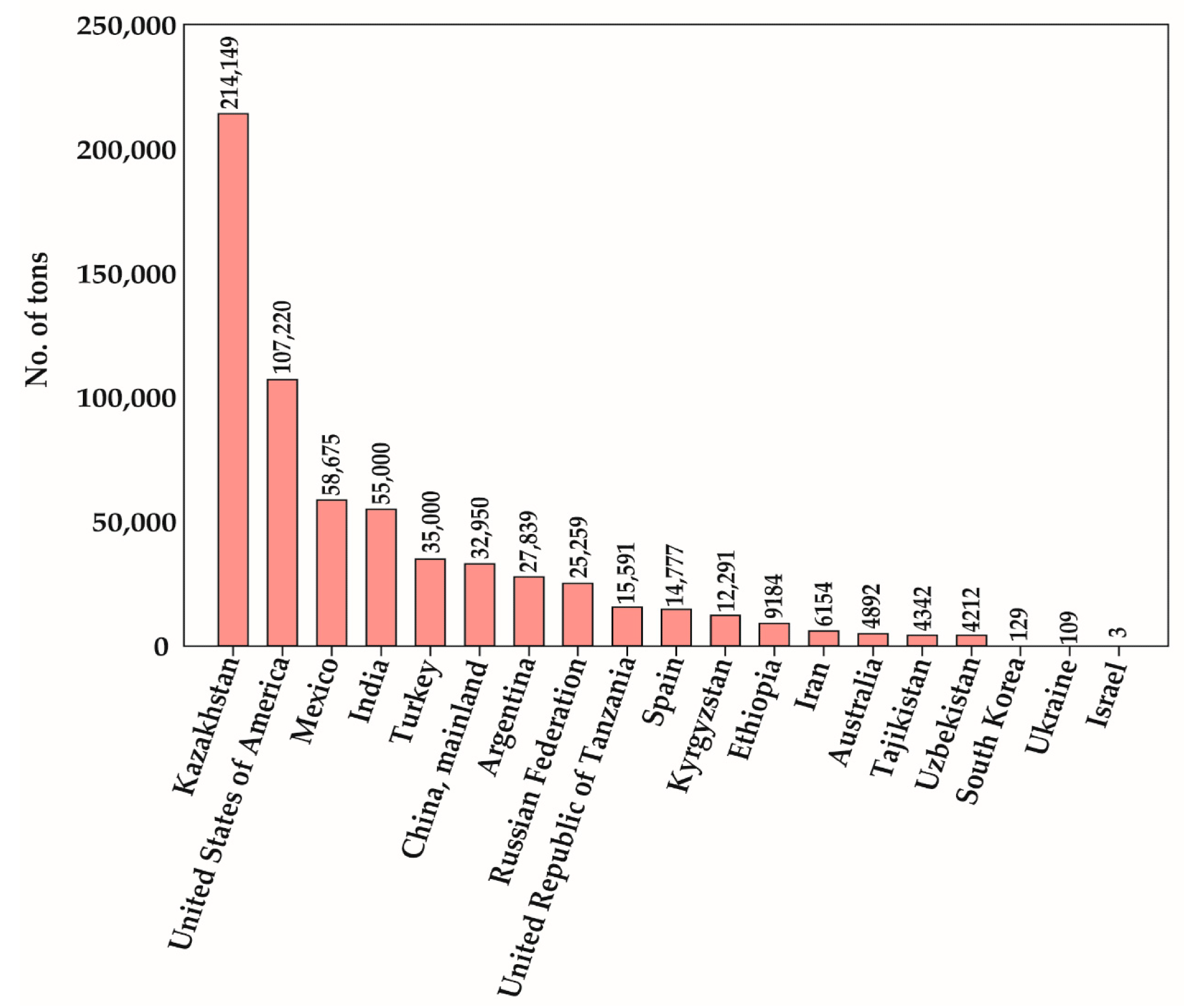 List of the world’s top safflower-producing countries in 2018. The total production value for each country is shown in the graph. The country-wise production statistics were obtained from FAOSTAT (2020) [9], while the production value of South Korea was obtained from the database of the Ministry of Agriculture, Food and Rural Affairs, Korea.1