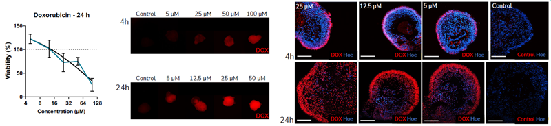 D. Retinal organoids were assessed for their suitability for studies with small molecules. In order to test whether small molecules penetrate the organoids, doxorubicin was used as a test compound. The intrinsic fluorescence of doxorubicin facilitates visualization of the drug penetration. Exposure of the iPSC-derived retinal organoids to doxorubicin reduced cell viability in a dose-dependent manner. Immunofluorescence analysis showed that doxorubicin penetrates the organoids after 4 and 24 h incubation. Image Credit: Newcells Biotech