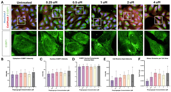 Figure 2. Thapsigargin- and sorbitol-induced stress response in U-2 OS. U-2 OS cells were treated with (A) 0.25 μM – 4 μM thapsigargin for 2 hours, or (B) 50 mM - 400 mM sorbitol for 1 hour, and immunolabelled for G3BP1 (green) and dyed with Hoechst (blue) and CellMask (red) (scale bars = 100 μM). Thapsigargin did not induce a consistent stress response, as evidenced in quantification of (C) G3BP1 intensity in the cytoplasm, (D) G3BP1 intensity in the nucleus, (E) G3BP1 nuclear/cytoplasmic intensity ratio, (F) relative G3BP1 spot intensity, and (G) G3BP1 spot count per cytoplasm area. Stress granule formation was induced with 400 mM sorbitol, as shown in quantification of (H) G3BP1 bright spot count, (I) G3BP1 spot count per cytoplasm area, (J) G3BP1 spot contrast, and (K) relative G3BP1 spot intensity. Statistical analysis: one-way ANOVA with Dunnett’s multiple comparisons test (* = p< 0.05, ** = p< 0.01, **** = p< 0.0001). Image Credit: Image courtesy of Daisy Maiden et al., in partnership with ELRIG (UK) Ltd.