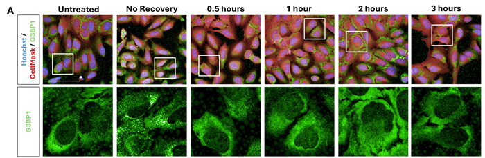Stress granules (SGs) are small membraneless organelles that transiently form in response to stress. SGs mediate cellular response to external stress (e.g. heat, oxidative, osmotic, organelle stress1,2,3), in conjunction with the integrated stress response (ISR). SG formation is necessary for the survival of stressed cells and functions by sequestering ribonucleoproteins (RNPs), mRNA, and translation factors. Many of the sequestered mRNAs encode proteins involved in apoptotic signalling cascades, demonstrating the role of SGs in cell survival. 3,4,5