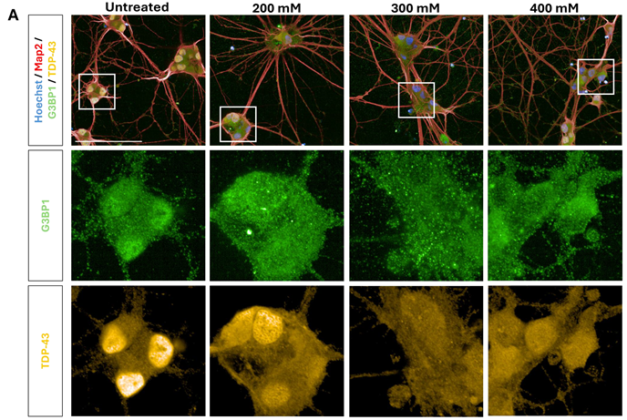 Figure 4. Sorbitol concentration gradient in motor neurons. (A) iPSC-derived motor neurons were treated with 50 mM – 400 mM sorbitol for 1 hour, then immunolabelled for G3BP1 (green), TDP-43 (yellow), Map2 (red), and dyed with Hoechst (blue) (Scale bar = 100 μM). SG formation was not reliably detected, as shown in (B) cytoplasmic G3BP1 spots normalized to cytoplasm area and (C) cytoplasmic TDP-43 spots normalized to cytoplasm area. Cell stress-induced changes in protein localization were detected at 200 mM – 400 mM, as seen in quantification of (D) G3BP1 nuclear/cytoplasmic localization ratio, and (E) TDP-43 nuclear/cytoplasmic localization ratio (a decreased ratio indicates increased relative localization to the cytoplasm). Statistical analysis: one-way ANOVA with Dunnett’s multiple comparisons test (** = p< 0.01, *** = p< 0.001, **** = p< 0.0001). Image Credit: Image courtesy of Daisy Maiden et al., in partnership with ELRIG (UK) Ltd.