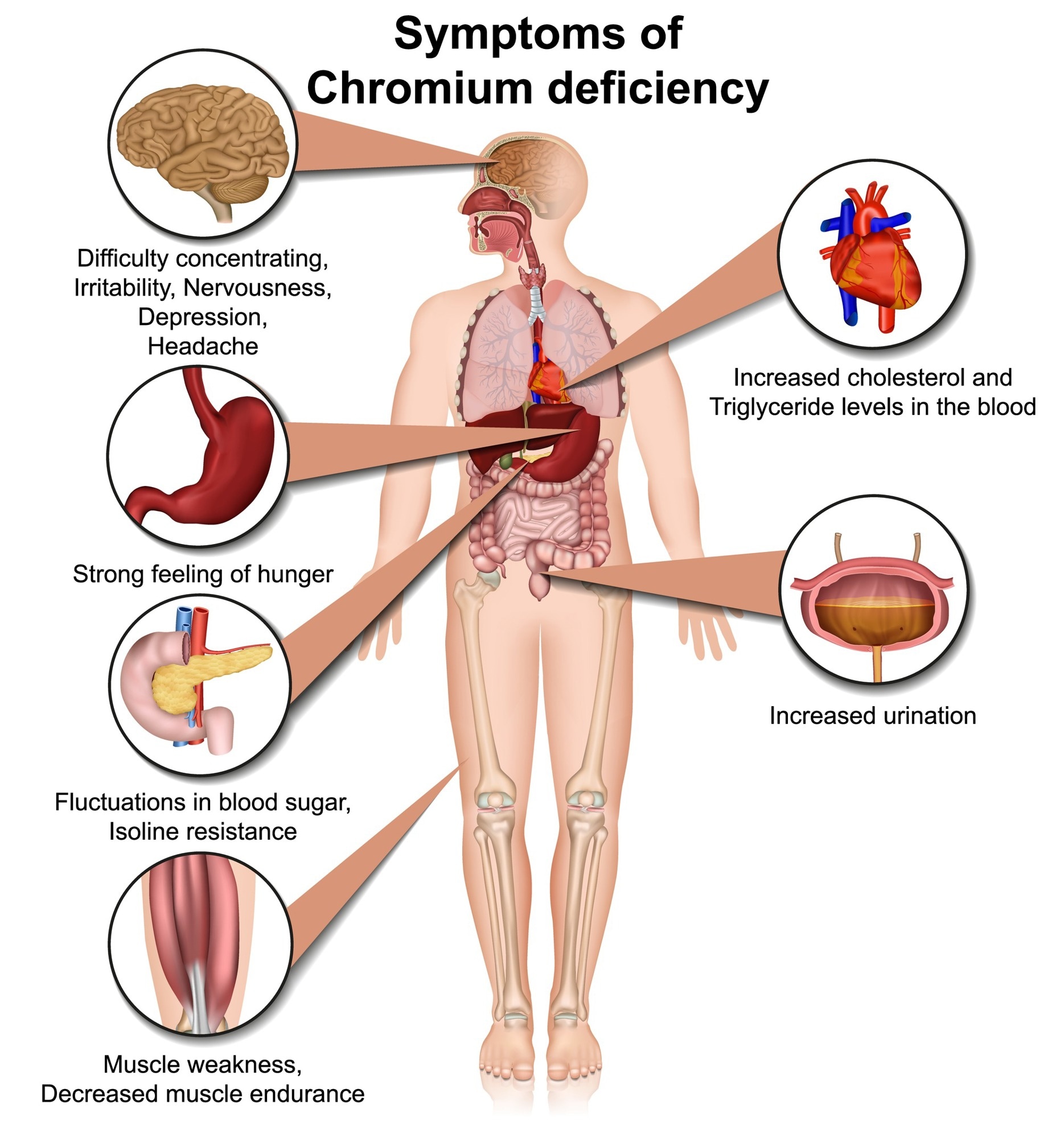 Chromium deficiency is rare in healthy individuals, and no validated biomarker of chromium status or clinically defined deficiency syndrome exists, but TPN-related cases responded to added chromium. Symptoms include impaired glucose tolerance, hyperglycemia, weight loss, peripheral neuropathy, and confusion, which improve with supplementation. Epidemiologic studies associate lower chromium levels with adverse lipid profiles and cardiometabolic risk, though causality is unproven.1,3,7,12