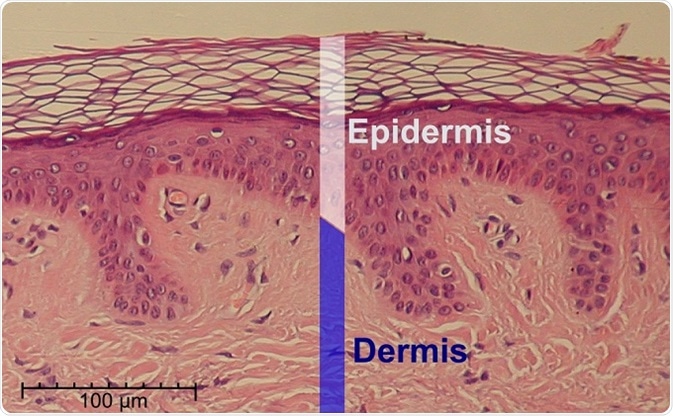 A hematoxylin and eosin stained slide of normal epidermis and dermis.