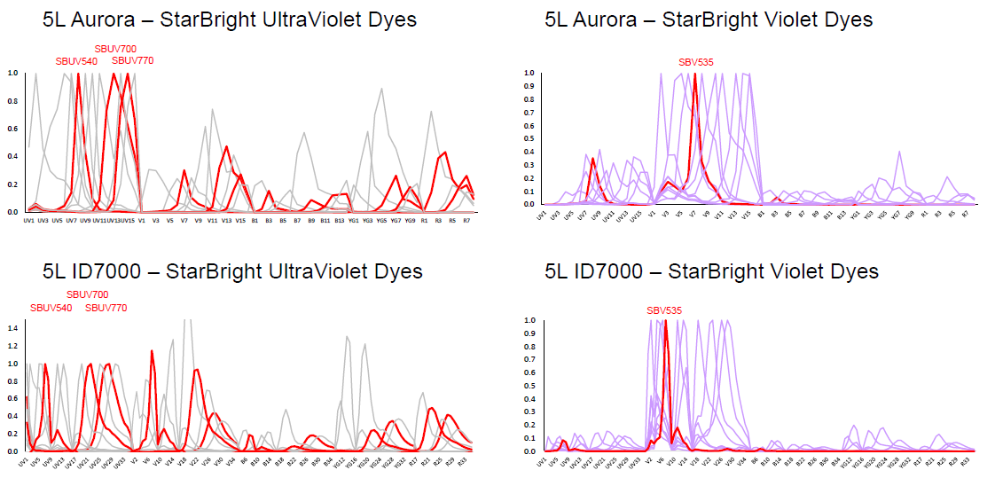 These dyes are bright and work well with the existing collection of 32 StarBright Dyes, as well as other frequently used fluorescent dyes in flow cytometry on both the Cytek Aurora and Sony ID7000.