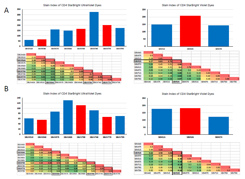 Fig. 2. Similarity scores and Stain Index of StarBright UltraViolet and Violet Dyes. Human PBMCs stained with Mouse anti Human CD4 conjugated antibodies. Data generated on A. Cytek Aurora B. Sony ID7000. Image Credit: Image courtesy of Sharon Sanderson et al., in partnership with ELRIG (UK) Ltd.