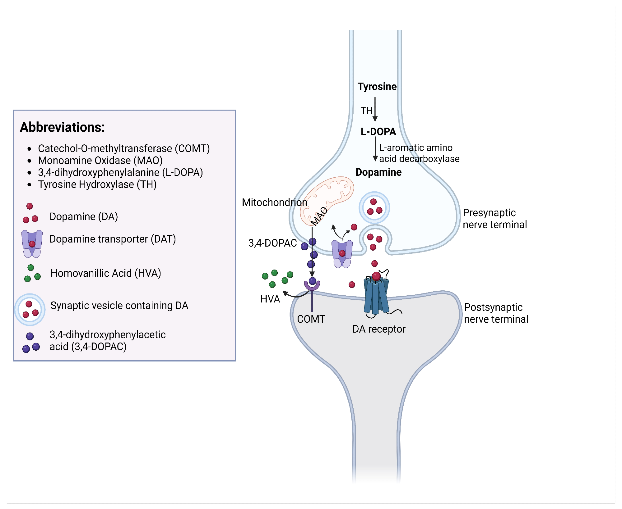 The processes of DA synthesis, reuptake, and metabolism occurring at a dopaminergic synapse.4
