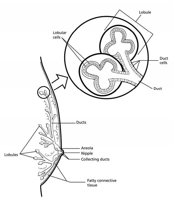 Until puberty, young boys and girls have a small amount of breast tissue consisting of a few ducts located under the nipple and areola (dark area around the nipple). At puberty, the female hormones in girls cause the breast ducts to grow, lobules to form at the ends of ducts, and the amount of stroma to increase.