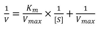 As you can see this equation follows the equation of a line: y = mx + c, which means that it can be plotted easily into a linear graph. Vmax and  Km can then be calculated as the y-intercept of the graph equals 1/Vmax and the x-intercept equals -1/Km.