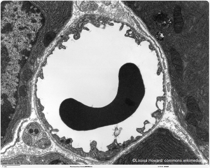 The image shows the cross section of a capillary with a red blood cell present, taken using a transmission electron microscpe.