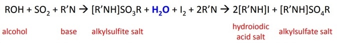The reaction titrates the volume of KF reagent required to react the iodine until all the water in the sample is completely used up, at which point the excess iodine is detected by the indicator. The water is used up during the oxidation of the alkyl sulfite intermediate by iodine. The reaction is pH sensitive.