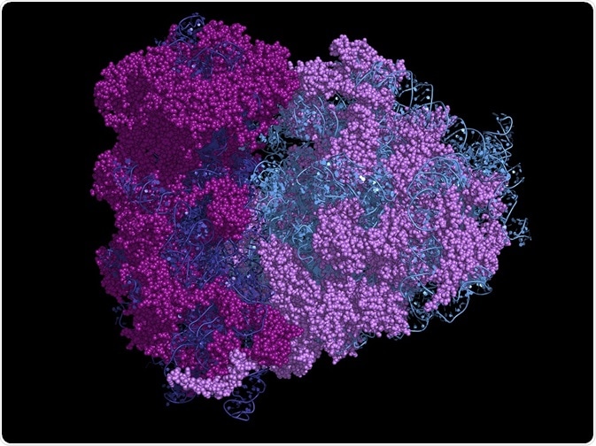 In a eukaryotic ribosome, there are two subunits, one larger and one smaller. The larger subunit of 60S is made up of 5S rRNA, 5.8S rRNA, 28S rRNA as well as 50 other proteins; whereas, the small subunit of 40S is made up of 33 proteins as well as 18S rRNA. When the ribosomal subunits have been assembled, they are transported to the cytoplasm.
