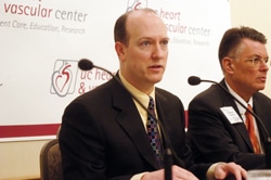Daniel Snavely, MD, assistant professor and interventional cardiologist at UC and Walter H. Merrill, MD, professor and chief of UC cardiothoracic surgery, work together to conduct tests that determine if standard therapy is no longer an option for patients and if they have appropriate areas on their heart to receive the injection of the growth factor protein.