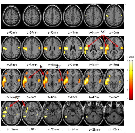 This figure shows the areas of the brain that "lit up" with higher metabolism during food stimulation in the study. The colored areas are from a statistical parametric mapping (SPM) analysis of PET scans of all subjects in both the food stimulation and neutral intervention conditions of the study. These images are superimposed on MR images from one person's brain (taken from above), which are used to demonstrate correct anatomical positioning. All "lit" areas represent significant differences in metabolism between the two study conditions: white represents higher metabolism while red represents lower metabolism.