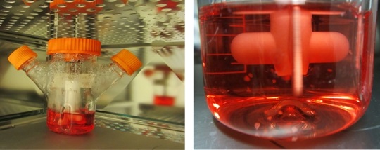 The spinning bioreactor system used for growth of cerebral organoids. At right, a close-up showing the floating organoids within the bioreactor. Credit: Copyright: IMBA/Magdalena Renner