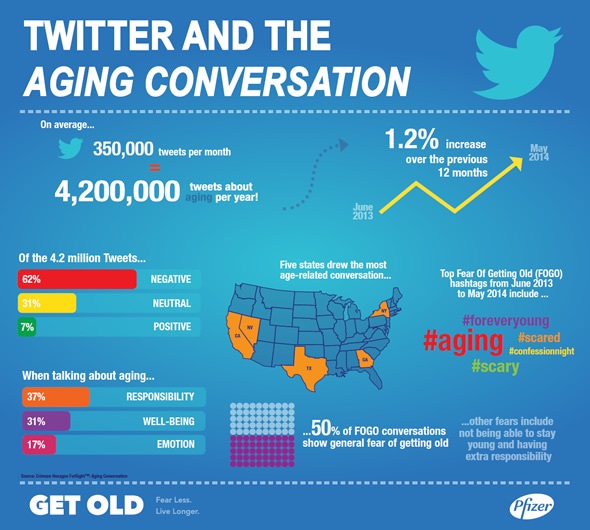 This year, Pfizer commissioned a study of Twitter and the Aging Conversation. We found that on average, there were about 350,000 tweets a month – totalling 4.2 million tweets in the last year - about aging. So people are certainly talking about aging and their fears of getting old via social media channels.