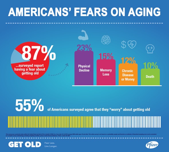 Pfizer’s Get Old recently commissioned a new Harris Poll on Americans’ fears on aging. The survey showed that 87% of people have a fear about getting old; nearly a quarter (23%) of people had the most fear around a decline in physical abilities, followed by memory loss (15%) and having a chronic disease (12%) or running out of money (12%).