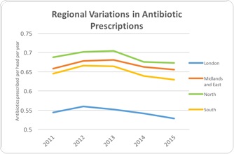 When analysing the data we are seeing a widening deprivation gap in antibiotic prescriptions. The gap between prescriptions in the 1% least and most deprived areas of England is 20%. We also see significant regional differences, for example London prescriptions are 21% lower than areas in the North.
