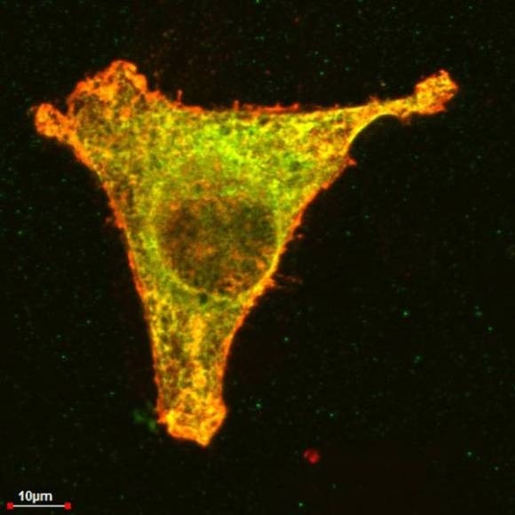 Tumor cell with some proteins highlighted in yellow (PHOTO: Bassermann/TUM)
