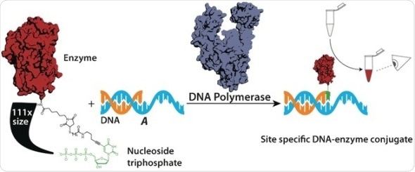 DNA polymerases read the information from a single strand of DNA and build up the complementary strand, one nucleotide at a time. Although they need to “recognize” the shape of the nucleotides to be included, the also accept slightly modified nucleotides. This is used in biotechnology for adding markers. A team led by Andreas Marx at the University of Konstanz have now demonstrated that highly selective DNA polymerases also incorporate nucleotides that have been attached to large proteins like horseradish peroxidase — even though this “cargo” is over 100 times larger than the nucleotide itself. The only requirement is that a linking group between the protein and the nucleotide must keep a minimum distance between them.