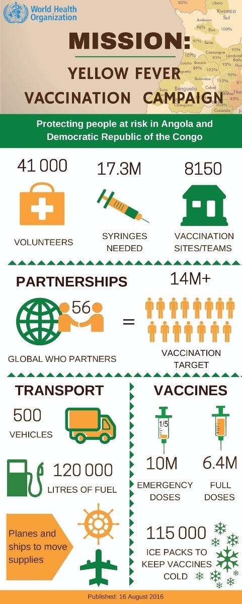 Emergency yellow fever vaccination campaigns have already reached more than 13 million people in Angola and more than 3 million in Democratic Republic of the Congo. These campaigns have been crucial to stopping the spread of the outbreak. Some areas are still considered at high risk and so preventive vaccination campaigns are planned for the capital city of Kinshasa in Democratic Republic of the Congo and along the country’s border with Angola, which spans 2646 km. The preventive vaccination campaign aims to build protection in the population perceived to be at high risk of getting infected and prevent potential spread and expansion of the current outbreak.