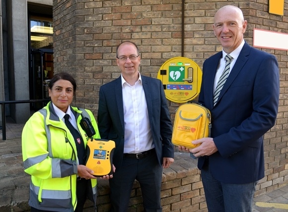 L-R: Kalash Singh from Security, Dave Hall Registrar and Chief Operating Officer and Mike Haynes-Coote, Director of Safety Services with one of the defibrillators. Credit: University of Leicester