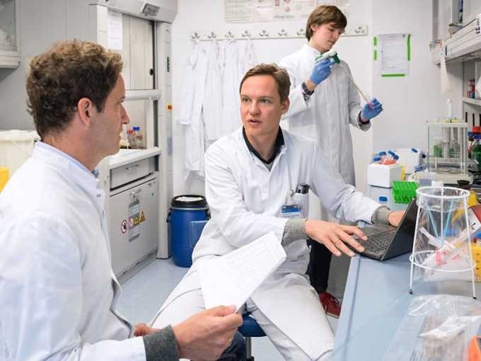 An international team led by PD Dr. Hendrik Poeck (center) and Dr. Tobias Haas (left) has developed a new approach to protect stem cell recipients from graft-versus-host disease. First author Julius Fischer is seen in the right half of the picture. (image: Benz / TUM)