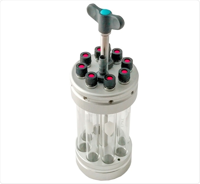 The compact DrySyn Octo parallel synthesizer accommodates low cost consumable reaction tubes each with a working volume of 5-6 ml. The large surface area of these glass reaction tubes enables the DrySyn Octo to be used for air cooled gentle reflux reactions.
