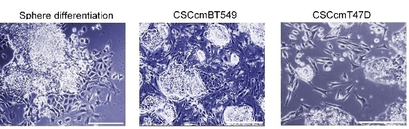 Seno and colleagues first created CSC-like cells following a protocol they had established earlier: by exposing the mouse induced pluripotent stem cells (miPSCs) , a type of reprogrammed cells with embryonic–like pluripotent state which can differentiate into any type of cells, to the conditioned medium prepared from the culture of human breast cancer cell line. The resulting cells displayed typical CSC-like phenotype. These cells exhibited three essential features of CSCs. The first one is self-renewal, which is attributed to a potential to form spheres in serum-free suspension cultures. The second one is ability to form malignant tumors in vivo. And the last one is the potential of differentiation. Here in this case the phenotype of CAF is found as one of the phenotypes CSCs differentiate into. The researchers then separated fibroblast-like cells differentiating from CSC-like spheres in the presence of conditioned medium. These cells were compared with fibroblast-like cells generated directly from miPS cells. Comparative analysis revealed that CSC generated fibroblast-like cells displayed CAF-like phenotype. Therefore, Seno and co-workers concluded that the conditioned medium plays a key role in the differentiation of CSC-like spheres into CAFs.