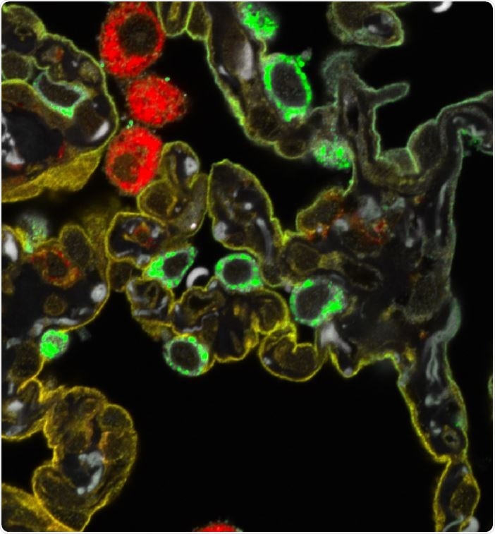 An sFLIM image of lung tissue labeled with three fluorophores (red, yellow and green colors). The label locations are clearly visible against the otherwise strong autofluorescence background (gray).