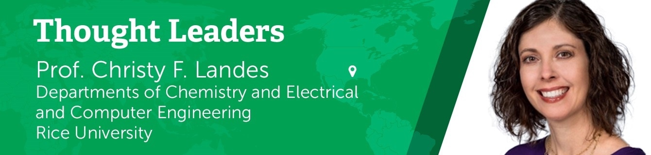 Christy F. Landes is a Professor in the Departments of Chemistry and Electrical and Computer Engineering at Rice University in Houston, TX. After graduating from George Mason University in 1998, she completed a Ph.D. in Physical Chemistry from the Georgia Institute of Technology in 2003 under the direction of National Academy member Prof. Mostafa El-Sayed.
