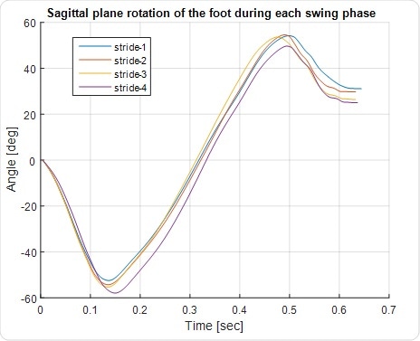 Sagittal plane foot angle during the gait cycle. Zero angle represents the angle of the foot during foot flat. Positive values represent a rotation with the toes going upward and negative represents a rotation with the heels going upward. |