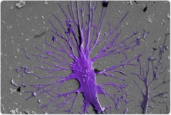 Podocyte Cells Color SEM: “A mature podocyte, colored purple, grows long extensions of its cell body known as “feet” that wrap around the kidney’s blood vessels and help filter impurities from the blood. Credit: Wyss Institute at Harvard University”
