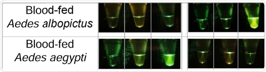“Direct nucleic acid analysis of mosquitoes using LAMP-OSD. Analysis of blood-fed mosquito macerates using coi and wsp LAMP-OSD assays. The Ae. aegypti-specific coi assay produces a bright signal only in the presence of Ae. aegypti mosquito sample. Similarly, the Wolbachia-specific wsp assay generates a signal only in Wolbachia-infected Ae. albopictus samples.”