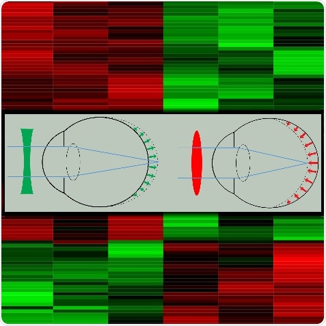 This image shows the effect of negative (green) and positive (red) lenses on eye growth and the heatmap depicting clusters of genes differentially expressed in the retina in response to optical defocus. Credit: Andrei V. Tkatchenko, CC-BY