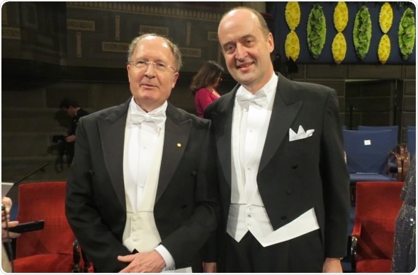 Dr John McCafferty (right) and Sir Gregory Winter (left) at the Nobel Prize Ceremony