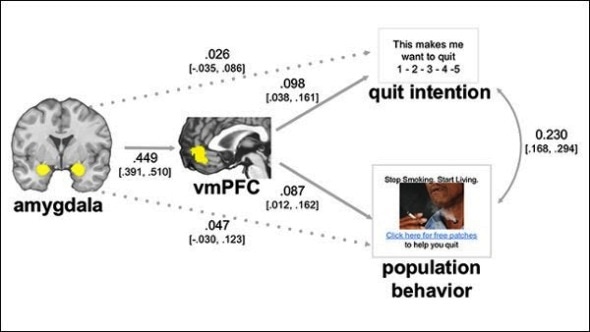 Bruce Dore, Emily Falk and colleagues identified a neural pathway between the amygdala — which was sensitive to the emotional content of the images — and the ventromedial prefrontal cortex that responded to graphic anti-smoking messages. A pattern of brain activity characteristic of emotional regulation predicted the extent to which smokers reported being motivated to quit. The images that smokers said made them want to quit were the same ones that encouraged likely smokers to click through for more information in a New York State Smokers’ Quit Line email campaign. Together these results suggest neuroimaging can be used to predict individual- and population-level responses to persuasive health messages.