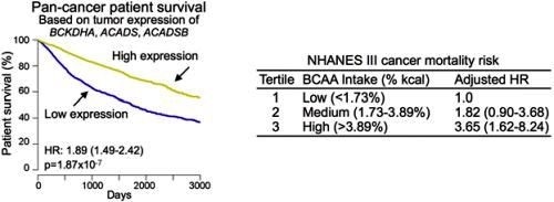 Figure 3: The left chart shows that patients with tumors that have high expression of the genes BCKDHA, ACADS and ACADSB live significantly longer than those with tumors that have low expression. The data was derived from the TCGA pan-cancer cohort of over 7,000 patients. The right chart shows the dietary analysis of the NHANES III cohort. It indicates that humans who have a high dietary intake of BCAA are more likely to develop and die from cancer.