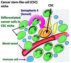 Semaphorin 3 (Sema3) produced by differentiated cancer cells in CSC niche affects CSCs. CSC niche contains various kinds of cells, including CSCs, differentiated cancer cells. endothelial cells in blood vessels, and immune cells. Sema3 is mainly produced by differentiated cancer cells in CSC niche.