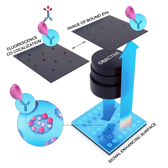 Exosomes are a type of extracellular vesicle, tiny particles released by cells as a means of communicating with other cells. The nucleic acids, lipids, and proteins carried by exosomes make them highly promising for diagnostic, prognostic, and even therapeutic use for a broad range of diseases including cancer. To date, no commercial technology has been capable of detecting and confirming exosome biomarkers with high specificity and sensitivity.
