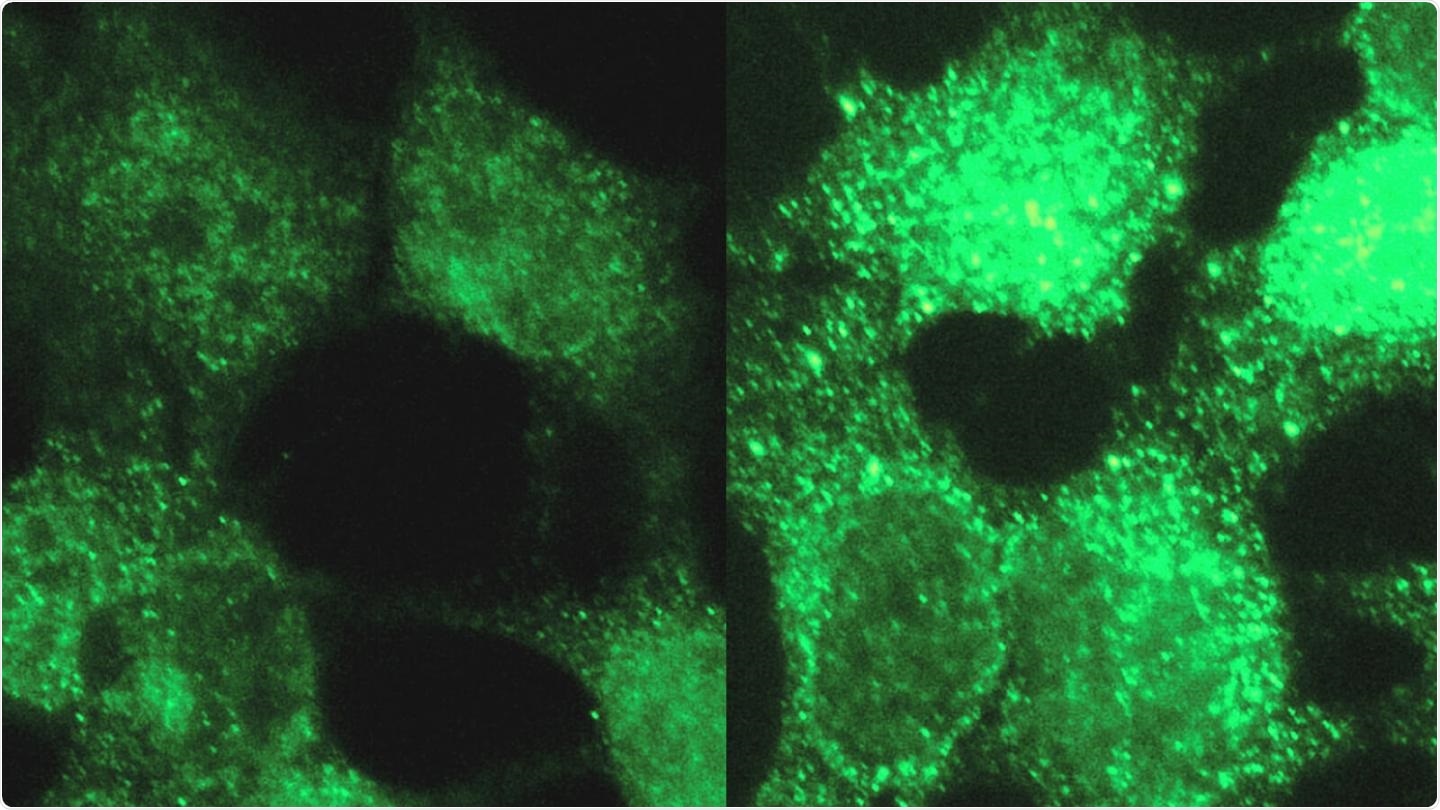In a demonstration of a tool for revealing molecular differences between diseases, researchers discovered four genes associated with a rare pediatric cancer. The image on the left shows a normal cell while the one on the right highlights one of the discovered genes in neuroblastoma, which afflicts babies and young children.