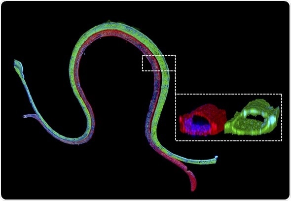 Immunofluorescence staining of a 3D bioprinted vascularized proximal tubule with a proximal tubule epithelial marker stained in green in the proximal tubule channel and a vascular endothelial marker stained in red in the adjacent vascular channel. The magnified cross-section illustrates that the two different cell types form luminal perfusable structures in their respective channels. Credit: Wyss Institute at Harvard University