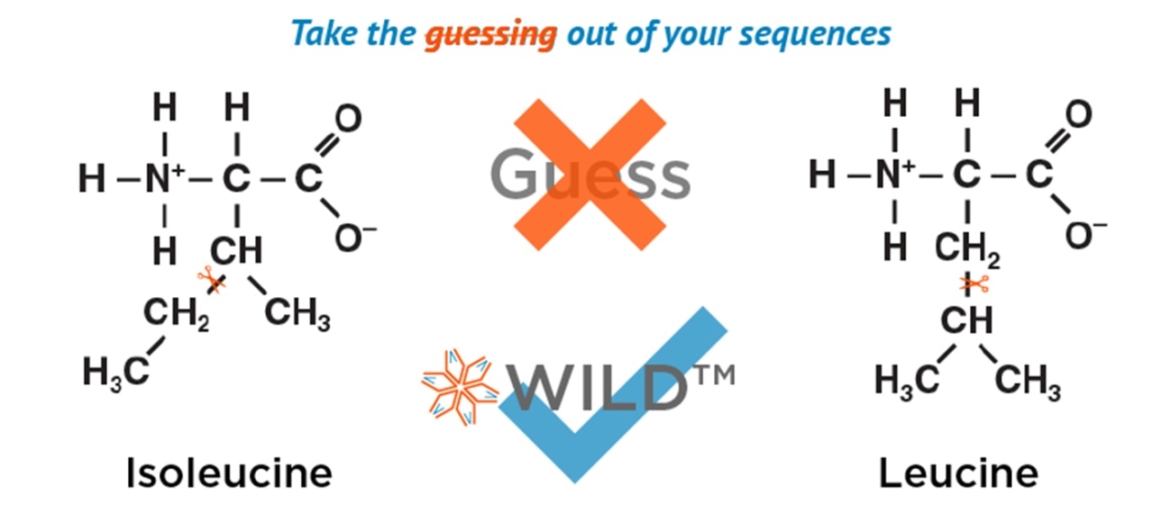Commonly, the enzyme chymotrypsin is used to generate a digest pattern that can help distinguish Ile from Leu residues. We also have employed enzymatic digestion of antibodies in the past. We noted that enzymes purchased from different vendors, used at different conditions, on different antibodies, behaved differently. We also found that the enzymatic error rate was very high and that the method was often irreproducible and unreliable. We thus sought to develop a high accuracy, repeatability and reliability method: WILD™.