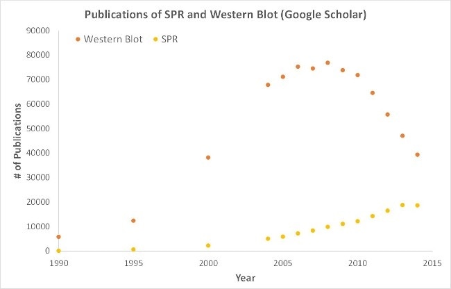 Significantly, OpenSPR represents a low maintenance, user-friendly benchtop SPR solution. Currently being utilized by hundreds of researchers, lab bench access to SPR technology is yielding the high-quality data that is required for successful publication. Moreover, although SPR is necessary for publications, it is also important for the development of many fields of medicine and medical research, as demonstrated by the significant increase in publications relying on SPR data, presented below.