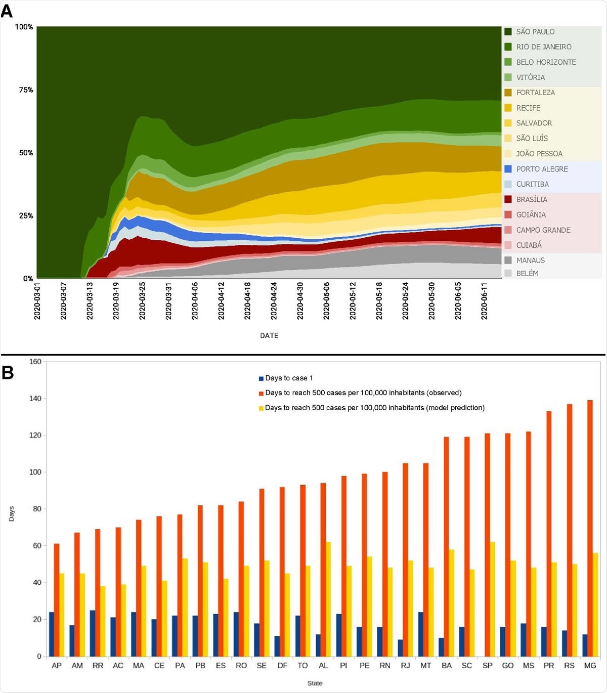 (A) Individual contribution of the 17 state capital cities that were responsible for 98% of spreading of COVID-19 cases for the 5570 Brazilian municipalities, from March 1st to June 11th. Notice how São Paulo contributed to more than 80% of all case spreading during the first weeks of March. Throughout the period until June 11th, São Paulo’s contribution never decreased below 30%. For that reason, the city was labeled as the COVID-19 super-spreader Brazilian city. Notice also the high contribution of Rio de Janeiro, Brasilia, and five state capitals in the Northeast region: Fortaleza, Recife, Salvador, São Luís, and João Pessoa. Manaus and Belém were the largest spreading cities in the North (Amazon) region and Porto Alegre and Curitiba the most important in the South region. During this period, the contributions of Goiânia, Campo Grande and Cuibá, in the Central-West region were the largest in their region but much smaller when compared to other regions and their spreaders. (B) Bars represent the day the first COVID-19 case (blue bars) was officially reported in each state (using São Paulo’s first case on February 26th, 2020 as the 0 reference), the number of days estimated by a mathematical model for each state to reach 500 cases per 100,000 inhabitants (yellow bars), and the days in which each of Brazilian states actually reach the mark of 500 cases per 100,000 inhabitants (orange bars). Notice how much longer it took for states like MT, BA, SC, SP, GO, MS, PR, MG to reach the 500/100,000 milestone when compared to states like AP, AM, RR, AC, PA, and TO in the North region, MA, CE, PB, PI, SE, AL, and RN in the Northeast region, ES in the Southeast region, and DF in the Center-West region.
