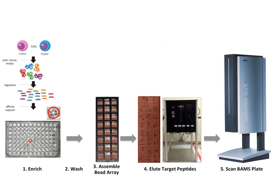 Affinity-Bead Assisted Mass Spectrometry (Affi-BAMS) harnesses the power of three main analytical techniques. We use magnetic beads that can simultaneously enrich protein targets within hundreds of samples, and we utilize microarrays to transfer or enrich targets, and this microarray is eluted with a MALDI matrix solution. This then ends up forming a very uniform microarray that can be fed into any mass spectrometer with a MALDI source.