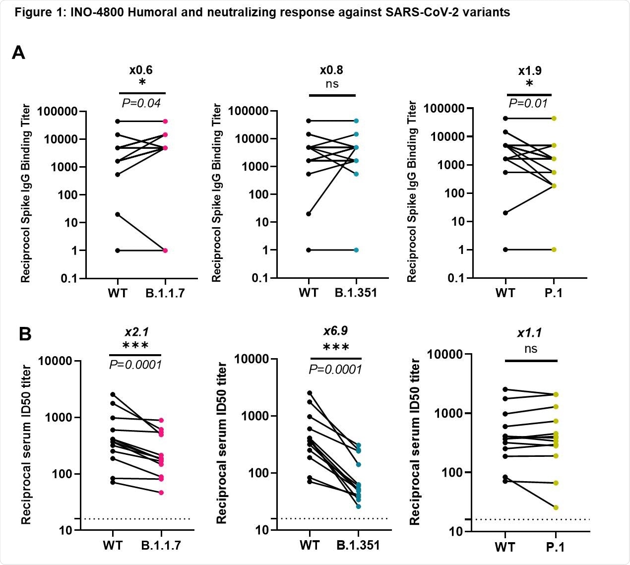 Among sera isolated from vaccinees at week 8 after administration of two doses of INO-4800, anti-SARS-CoV-2 spike IgG titers were not negatively impacted by wild-type virus or the B.1.1.7 or B.1.351 variant. However, a 1.9-fold reduction in IgG titer was observed for the P.1 variant.