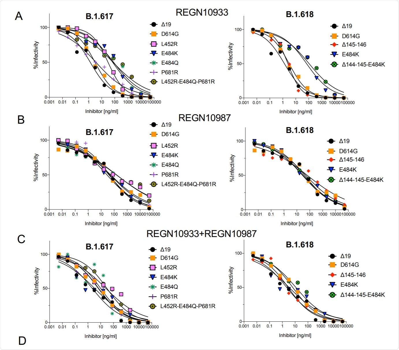 Neutralization of B.1.617 and B.1.618 spike protein variants by REGN10933 and REGN10987. Image Credit: https://www.biorxiv.org/content/10.1101/2021.05.14.444076v1.full.pdf