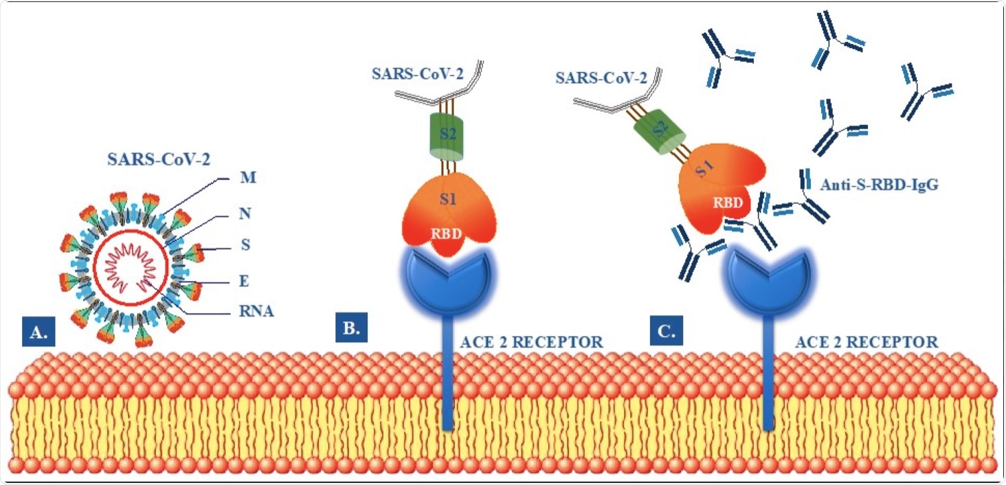 Schematic illustration of postulated mechanism modulating SARS-CoV-2 attachment, fusion and neutralizing activity of anti-S-RBD IgG SARS-CoV-2 antibodies. (A) Structural components SARS-CoV-2: Envelop Protein (E), Membrane glycoprotein (M), Nucleocapside protein (N), RiboNucleic Acid (RNA), Spike protein (S). (B) Binding of Receptor-Binding Domain (RBD) to the Angiotensin-converting enzyme 2 (ACE2) Receptor. (C) Inhibition of S-RBD binding to the ACE2 receptor by neutralizing anti-S-RBD IgG antibodies.