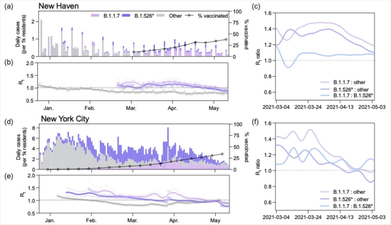 B.1.1.7 had a larger effective reproduction number (Rt) than B.1.526 during the COVID-19 vaccination campaign. (a, d) Daily incidence and full vaccination rates (2 weeks post last dose) of B.1.1.7, B.1.526*, and other circulating lineages in New Haven County (a) and New York City (d). Daily cases were assigned to one of three lineage categories (‘B.1.1.7’, ‘B.1.526*’, and ‘other’) according to the 7-day rolling average of variant frequency among sequenced cases. ‘B.1.526*’ includes the sublineages B.1.526, B.1.526.1, and B.1.526.2. (b, e) Time-varying effective reproduction numbers (Rt) were calculated using the R package epiEstim. An Rt value above 1 indicates that an infected individual will, on average, infect more than 1 additional person. We assumed a serial interval of mean 5.2 days and standard deviation of 4 days for all lineages. We used a smoothing spline to smooth the daily Rt curves (line) with the package, stat in R v4.0.1. Non-smoothed estimates are shown as individual points. 0.025 and 0.975 quantiles are shown as dotted lines (c, f) Ratios of estimated Rt between March 4 and May 4, 2021 calculated using the splines shown in (b) and (e).